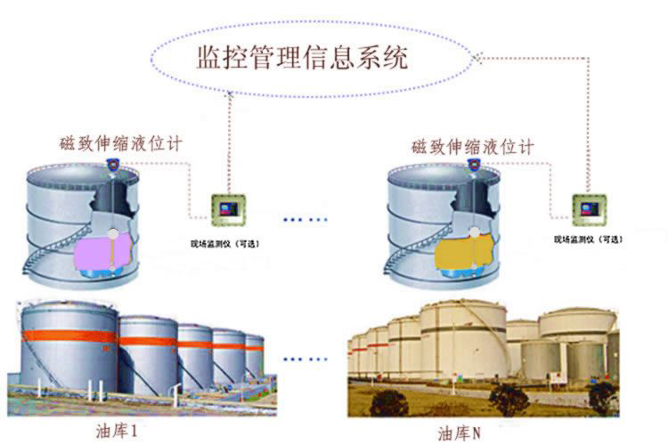 油库油罐液位自动计量系统: 用杆式或缆式液位计,配置多功能液位监控仪,可同时显示128个油罐的数据;可同时显示液位和界位;管理软件自动显示油品的进销存情况,实时监控,并自动盘存,生成班、日、月报表。